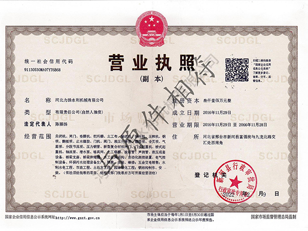 河北力揚(yáng)水利機(jī)械有限公司,成立于2016年,地址河北省邢臺(tái)市新河縣富強(qiáng)街與九龍北路交匯處西南角具備生產(chǎn)及供應(yīng)、安裝能力。我們公司位于董振堂將軍故里,河北省邢臺(tái)市新河縣九龍工業(yè)區(qū),是一家集設(shè)計(jì)、生產(chǎn)、銷(xiāo)售、安裝、售后一體的綜合性水利機(jī)械廠家,現(xiàn)有人員共40余名,獲有國(guó)家頒發(fā)的全國(guó)工業(yè)產(chǎn)品生產(chǎn)許可證、ISO質(zhì)量管理體系認(rèn)證、環(huán)境體系認(rèn)證、職業(yè)健康體系認(rèn)證并且我公司通過(guò)水利相關(guān)部門(mén)水工金屬結(jié)構(gòu)質(zhì)量檢驗(yàn)中心的考核和監(jiān)督下獲得了:認(rèn)證頒發(fā)的四項(xiàng)產(chǎn)品認(rèn)證證書(shū)(平面閘門(mén)、弧形閘門(mén)、回轉(zhuǎn)式清污機(jī)、耙斗式清污